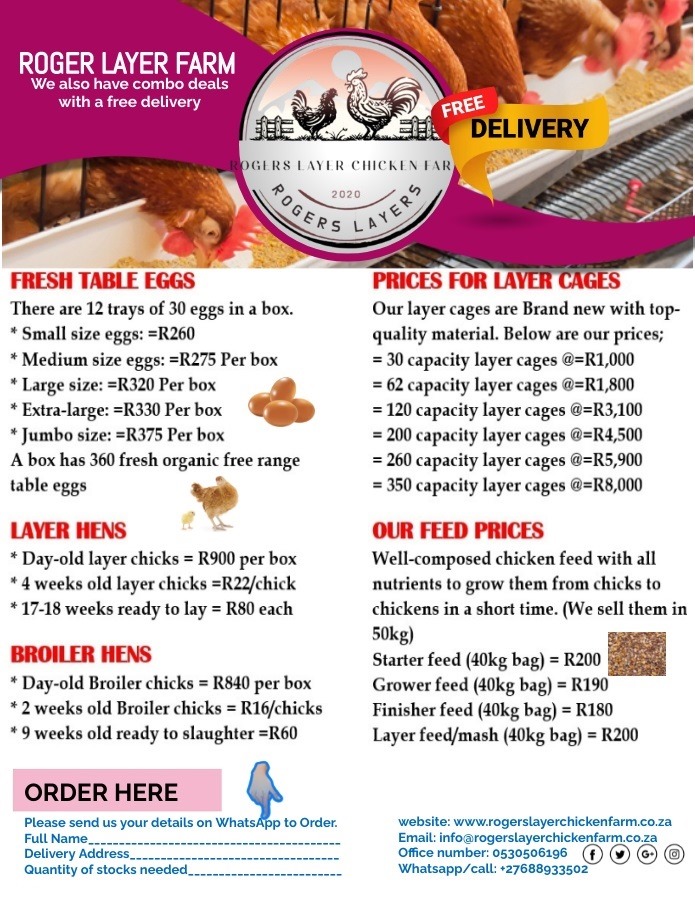 Please click on the menu to see our special combo offers on Table eggs, Layer hens, and 2 weeks old Broilers
